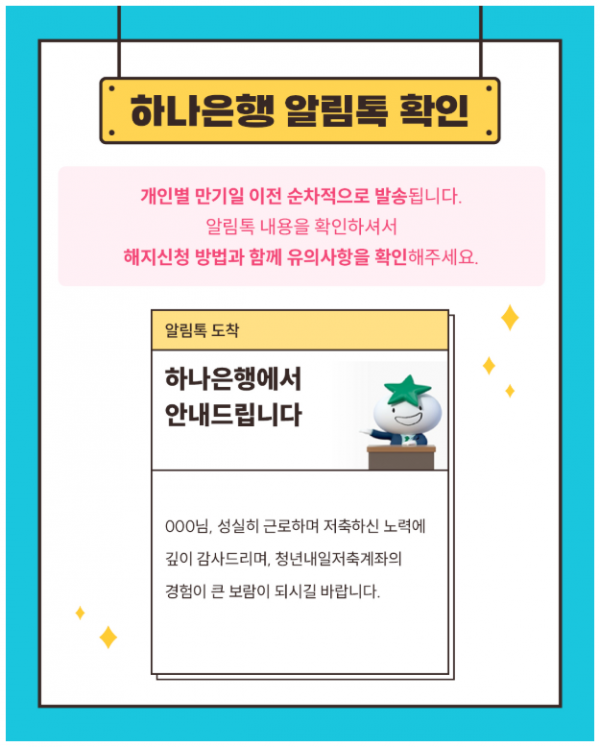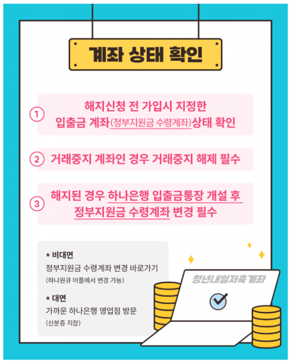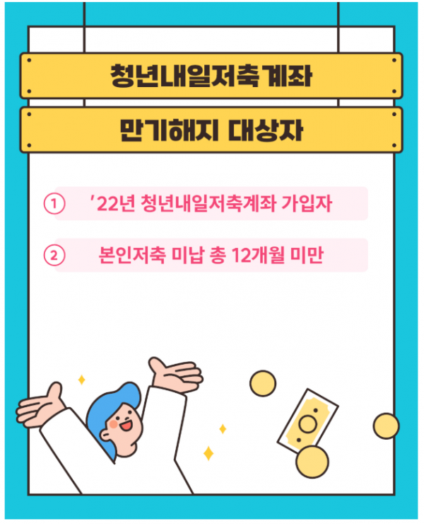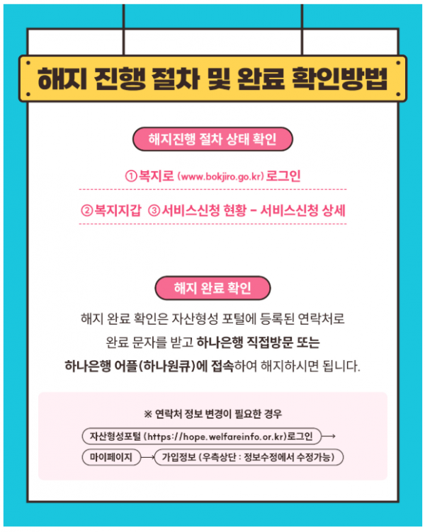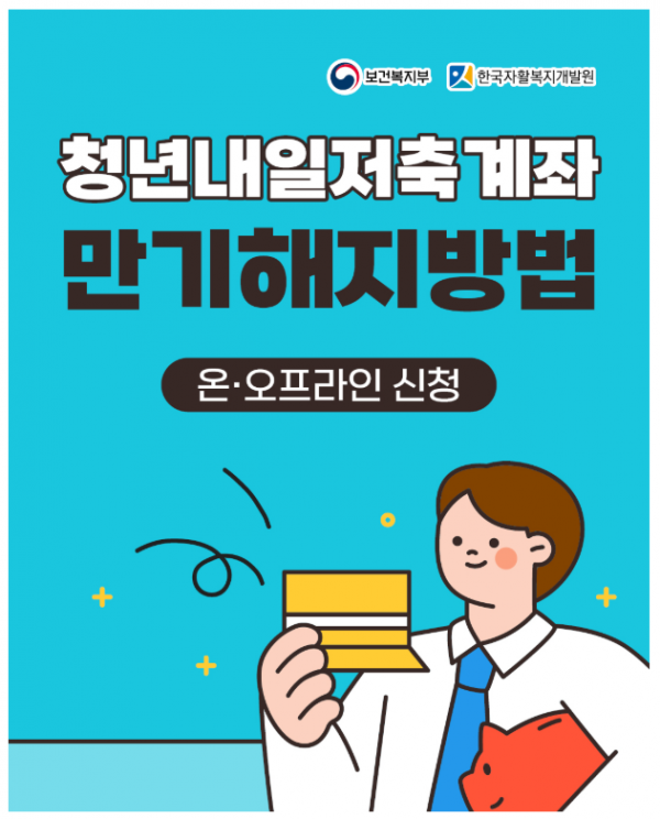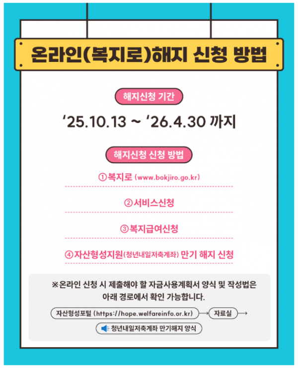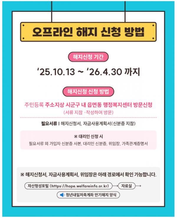 2025년 청년내일저축계좌 만기해지 신청방법 안내 작성자 관리자 등록일 2025-10-30 조회수 116 - 출처 : 한국자활복지개발원(자산e룸터) https://hope.welfareinfo.or.kr 첨부파일 [붙임1]해지신청서.pdf (146.3K) [붙임2]자금사용계획서.pdf (128.8K) [붙임3]위임장.pdf (37.8K)